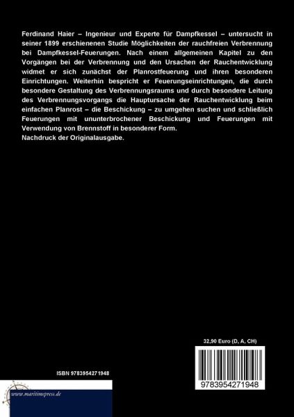 Ferdinand Haier Ingenieur und Experte für Dampfkessel untersucht in seiner 1899 erschienenen Studie Möglichkeiten der rauchfreien Verbrennung bei Dampfkessel-Feuerungen. Nach einem allgemeinen Kapitel zu den Vorgängen bei der Verbrennung und den Ursachen der Rauchentwicklung widmet er sich zunächst der Planrostfeuerung und ihren besonderen Einrichtungen. Weiterhin bespricht er Feuerungseinrichtungen, die durch besondere Gestaltung des Verbrennungsraums und durch besondere Leitung des Verbrennungsvorgangs die Hauptursache der Rauchentwicklung beim einfachen Planrost die Beschickung zu umgehen suchen und schließlich Feuerungen mit ununterbrochener Beschickung und Feuerungen mit Verwendung von Brennstoff in besonderer Form.
