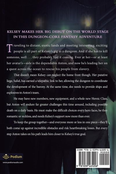 Kelsey makes her big debut on the world stage in the second book of this dungeon-core fantasy adventure from the author of the Phantasm series. Traveling to distant, exotic lands and meeting interesting, exciting people is all part of Kelsey's gig as a dungeon. And if she has to kill someone, well . . . they probably had it coming. Ever at her-or at least her avatar's-side is the dependable Anton, and now he's leading her on a quest across the ocean to rescue his people from slavery. That doesn't mean Kelsey can neglect the home front though. Her putative liege, Suliel, has earned a telepathic link to her, allowing the dungeon to coordinate the development of the barony. At the same time, she needs to provide ships and explosives to Anton's team. He may have new members, new equipment, and a whole new Heroic Class, but Anton will endure far greater challenges this time around, including possible death on a daily basis. He must make the difficult choices every hero faces, be they romantic or reckless, and needs Kelsey's support now more than ever. To keep the group together-and everyone more or less in one piece-they'll both come up against incredible obstacles and risk heartbreaking losses. But every step Anton takes on his path leads him closer to Kelsey's true goal.