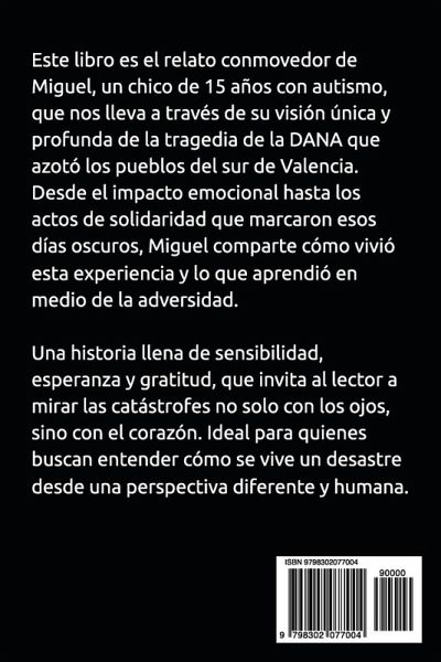 Este libro es el relato conmovedor de Miguel, un chico de 15 años con autismo, que nos lleva a través de su visión única y profunda de la tragedia de la DANA que azotó los pueblos del sur de Valencia. Desde el impacto emocional hasta los actos de solidaridad que marcaron esos días oscuros, Miguel comparte cómo vivió esta experiencia y lo que aprendió en medio de la adversidad. Una historia llena de sensibilidad, esperanza y gratitud, que invita al lector a mirar las catástrofes no solo con los ojos, sino con el corazón. Ideal para quienes buscan entender cómo se vive un desastre desde una perspectiva diferente y humana.