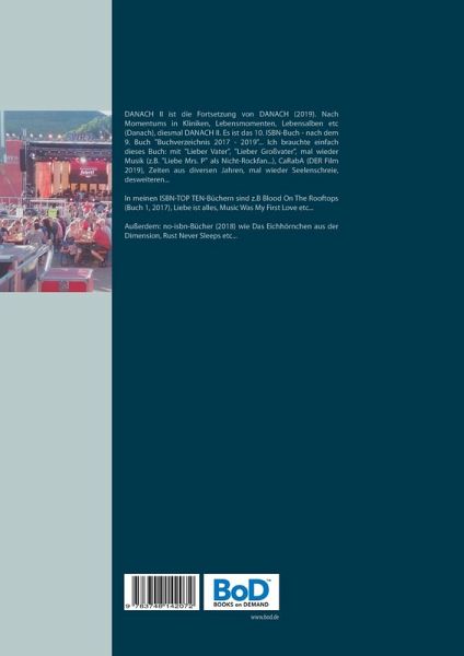 DANACH II ist die Fortsetzung von DANACH (2019). Nach Momentums in Kliniken, Lebensmomenten, Lebensalben etc (Danach), diesmal DANACH II. Es ist das 10. ISBN-Buch - nach dem 9. Buch "Buchverzeichnis 2017 - 2019"... Ich brauchte einfach dieses Buch: mit "Lieber Vater", "Lieber Großvater", mal wieder Musik (z.B. "Liebe Mrs. P" als Nicht-Rockfan...), CaRabA (DER Film 2019), Zeiten aus diversen Jahren, mal wieder Seelenschreie, desweiteren...In meinen ISBN-TOP TEN-Büchern sind z.B Blood On The Rooftops (Buch 1, 2017), Liebe ist alles, Music Was My First Love etc...Außerdem: no-isbn-Bücher (2018) wie Das Eichhörnchen aus der Dimension, Rust Never Sleeps etc...