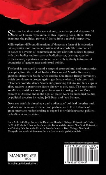 This book examines the political power of dance, particularly its transgressive potential. Focusing on readings of dance pioneers Isadora Duncan and Martha Graham, Gumboots dancers in the gold mines of South Africa, the One Billion Rising movement, dabke in Palestine and dance as a protest against human rights abuse in Israel, the book explores moments in which the form succeeds in transgressing politics as articulated in words. Close readings and critical analysis grounded in radical democratic theory combine to show how interpreting political dance as 'interruption' can unsettle conceptions of both politics and dance. An electronic edition of this book is freely available under a Creative Commons (CC BY-NC-ND) licence.