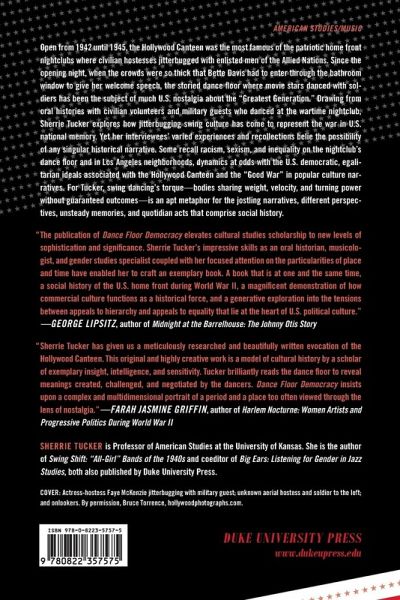Open from 1942 until 1945, the Hollywood Canteen was the most famous of the patriotic home front nightclubs where civilian hostesses jitterbugged with enlisted men of the Allied Nations. Since the opening night, when the crowds were so thick that Bette Davis had to enter through the bathroom window to give her welcome speech, the storied dance floor where movie stars danced with soldiers has been the subject of much U.S. nostalgia about the "Greatest Generation." Drawing from oral histories with civilian volunteers and military guests who danced at the wartime nightclub, Sherrie Tucker explores how jitterbugging swing culture has come to represent the war in U.S. national memory. Yet her interviewees' varied experiences and recollections belie the possibility of any singular historical narrative. Some recall racism, sexism, and inequality on the nightclub's dance floor and in Los Angeles neighborhoods, dynamics at odds with the U.S. democratic, egalitarian ideals associated with the Hollywood Canteen and the "Good War" in popular culture narratives. For Tucker, swing dancing's torque-bodies sharing weight, velocity, and turning power without guaranteed outcomes-is an apt metaphor for the jostling narratives, different perspectives, unsteady memories, and quotidian acts that comprise social history.