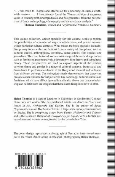 '...full credit to Thomas and Macmillan for embarking on such a worthwhile venture - Dance Research I have already found the Thomas edition of enormous value in teaching both undergraduates and postgraduates, from the perspectives of dance anthropology, ethnography and theatre dance analysis - Theresa Buckland, Department of Dance Studies, University of Surrey This unique collection of papers, written specially for this volume, explores the aspects of the ways in which dance and gender intersect in a variety of cultural contexts, from social and disco dance to performance dance, to the Hollywood musical and dances from different cultures. The contributors come from a broad range of disciplines, such as cultural studies, anthropology, sociology, dance studies, film studies, and journalism. They bring to the book a wide body of ideas and approaches, including feminism, psychoanalysis, ethnography and subcultural theory. List of Plates - Preface to the 1995 Reprint - Notes on the Contributors - Introduction - PART 1: CULTURAL STUDIES - Dance, Gender and Culture; T.Polhumus - Dancing in the Dark: Rationalism and the Neglect of Social Dance; A.Ward - Ballet, Gender and Cultural Power; C.J.Novack - 'I Seem to Find the Happiness I Seek': Heterosexuality and Dance in the Musical; R.Dyer - PART 2: ETHNOGRAPHY - An-Other Voice: Young Women Dancing and Talking; H.Thomas - Gender Interchangeability among the Tiwi; A.Grau - 'Saturday Night Fever': An Ethnography of Disco Dancing; D.Walsh - Classical Indian Dance and Women's Status; J.L.Hanna - PART 3: THEORY/CRITICISM - Dance, Feminism and the Critique of the Visual; R.Copeland - 'You put your left foot in, then you shake it all about ...': Excursions and Incursions into Feminism and Bausch's Tanztheater; A.Sanchez-Colberg - 'She might pirouette on a daisy and it would not bend': Images of Femininity and Dance Appreciation; L-A.Sayers - Still Dancing Downwards and Talking Back; Z.Oyortey - The Anxiety of Dance Performance; V.Rimmer - Index