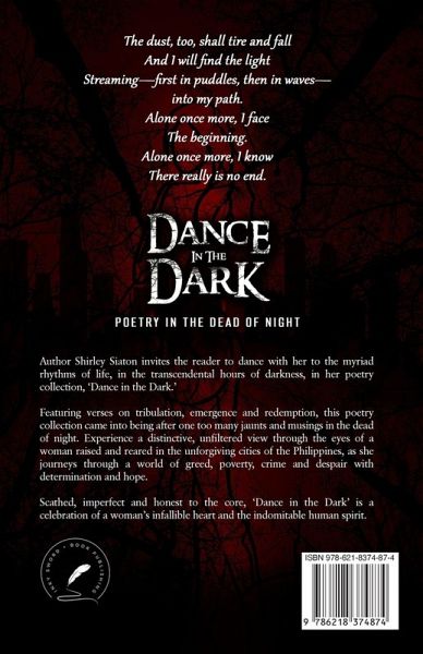 The dust, too, shall tire and fall And I will find the light Streaming-first in puddles, then in waves- into my path. Alone once more, I face The beginning. Alone once more, I know There really is no end. Author Shirley Siaton invites the reader to dance with her to the myriad rhythms of life, in the transcendental hours of darkness, in her poetry collection, 'Dance in the Dark.' Featuring verses on tribulation, emergence and redemption, this poetry collection came into being after one too many jaunts and musings in the dead of night. Experience a distinctive, unfiltered view through the eyes of a woman raised and reared in the unforgiving cities of the Philippines, as she journeys through a world of greed, poverty, crime and despair with determination and hope. Scathed, imperfect and honest to the core, 'Dance in the Dark' is a celebration of a woman's infallible heart and the indomitable human spirit.