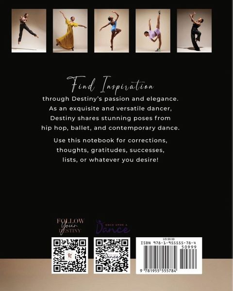Find Inspiration through Destiny's passion and elegance. As an exquisite and versatile dancer, Destiny shares stunning poses from hip hop, ballet, and contemporary dance. ¿Use this notebook for corrections, thoughts, gratitudes, successes, lists, or whatever you desire! The left side has full-body studio photographs, and the right side has wide-ruled lines.