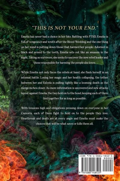 "This is not your end." Emelia has never had a choice in her fate. Battling with PTSD, Emelia is full of vengeance and wrath after the Blood Wedding and the one thing on her mind is putting down those that harmed her people. Adorned in black and armed to the teeth, Emelia sets out like an assassin in the night. Taking no survivors, she seeks to uncover the new rebel leader and those responsible for harming the people she loves. While Emelia not only faces the rebels at hand, she finds herself in an internal battle. Losing her magic and her health collapsing, the tether between her and Estreia is pulling tightly like a looming death as the merge inches closer. As more information is uncovered and new attacks layout against Emelia, the two hold on to the bond, keeping each of them tied together for as long as possible. With tensions high and obligations pressing down on everyone in her Camorra, each of them fight to hold on to the people they love. Heartbreak and death are at every angle and Emelia must make the choices that will be what saves or kills them all.
