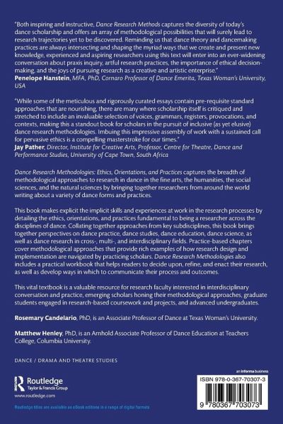 Dance Research Methodologies: Ethics, Orientations, and Practices captures the breadth of methodological approaches to research in dance in the fine arts, the humanities, the social sciences, and the natural sciences by bringing together researchers from around the world writing about a variety of dance forms and practices.