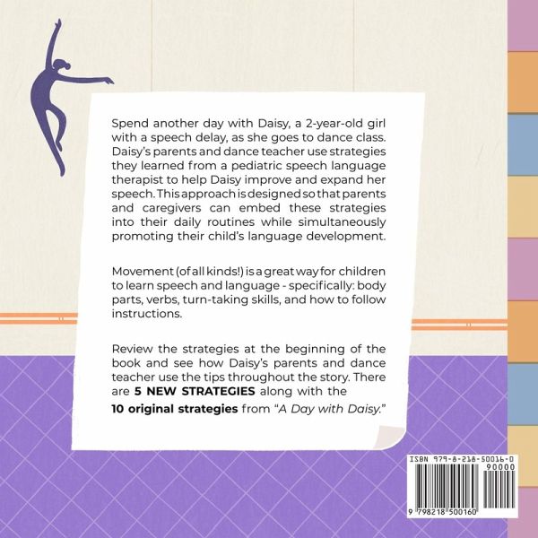 Spend another day with Daisy, a 2-year-old girl who has a speech delay, as she goes to dance class. Daisy's parents and dance teacher use strategies they learned from a pediatric speech language pathologist to help Daisy improve and expand her speech. This approach is designed so that parents and caregivers can embed these strategies into their daily routines while simultaneously promoting their child's language development. Review the strategies at the beginning of the book and see how Daisy's parents and dance teacher use the tips throughout the story. There are 5 NEW STRATEGIES and the 10 original strategies from "A Day with Daisy!" Learn signs from American Sign Language with Daisy! Movement (of all kinds!) is a great way for children to learn speech and language - specifically verbs, body parts, how to follow instructions, and turn- taking skills.