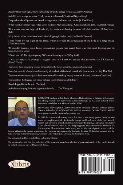Raj Napal was born in Port-Louis, Mauritius. He emigrated to Britain with his parents and siblings when he was eight years old. He was brought up in Cardiff in South Wales. Poetry was instilled in him while he lived in Wales. He obtained a law degree from Leeds University in Yorkshire and was a criminal defense barrister in London in the 80s and 90s. In 1995, he came to Ontario in Canada where he continued to practice law. In 2010, he commenced writing, but at that time, it was mostly poetry. In the last four years, his imagination took him into the strange world of the supernatural, horror and terror. He finds short stories particularly fascinating and "Dance with Terror' is a collection of stories in that intriguing genre. He continues to write poetry. He has self-published two books of poems, 'Salt and Sugar' and 'Food and Fruit' and hopes to compile a book of spiritual poems soon. He has also ventured into the field of crime-thriller serializations and supernatural adventures. Some are nearly finished and others are ongoing projects. He has two children, Joshua, and Helena. Raj, his children and their mother share a passion for reading and writing.