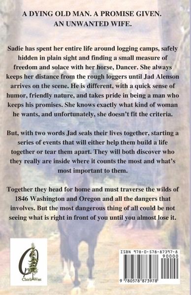 A dying old man. A promise given. An unwanted wife. Sadie has spent her entire life around logging camps, safely hidden in plain sight and finding a measure of freedom and solace with her horse, Dancer. She always keep her distance away from the rough loggers until Jad Alenson arrives on the scene. He is different, with a quick sense of humor, friendly nature, and takes pride in being a man who keeps his promises. She knows exactly what kind of woman he wants, and unfortunately, she doesn't fit the criteria. But, with two words Jad seals their lives together, starting a series of events that will either help them build a life together or tear them apart. They will both discover who they really are inside where it counts the most and what's most important to them.Together they head for home and must traverse the wilds of 1846 Washington and Oregon and all the dangers that involves. But, the most dangerous thing of all could be not seeing what is right in front of you until you almost lose it.