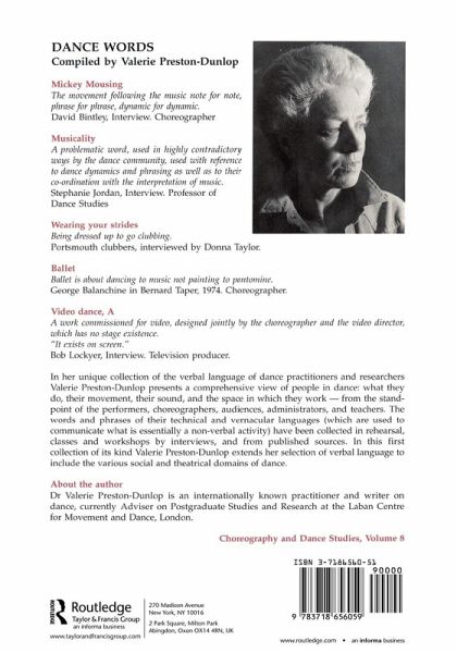 A collection of the verbal language of dance practitioners and researchers. This work presents people in dance, what they do, their movement, their sound and the space in which they work - from the standpoint of performers, choreographers, audiences and teachers.