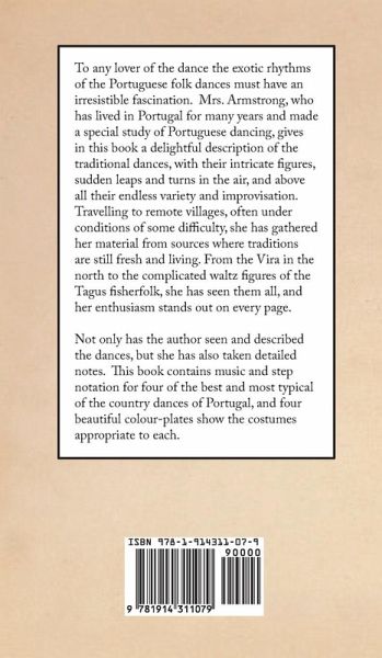 To any lover of the dance the exotic rhythms of the Portuguese folk dances must have an irresistible fascination. Mrs. Armstrong, who has lived in Portugal for many years and made a special study of Portuguese dancing, gives in this book a delightful description of the traditional dances, with their intricate figures, sudden leaps and turns in the air, and above all their endless variety and improvisation. Travelling to remote villages, often under conditions of some difficulty, she has gathered her material from sources where traditions are still fresh and living. From the Vira in the north to the complicated waltz figures of the Tagus fisherfolk, she has seen them all, and her enthusiasm stands out on every page. Not only has the author seen and described the dances, but she has also taken detailed notes. This book contains music and step notation for four of the best and most typical of the country dances of Portugal, and four beautiful colour-plates show the costumes appropriate to each.