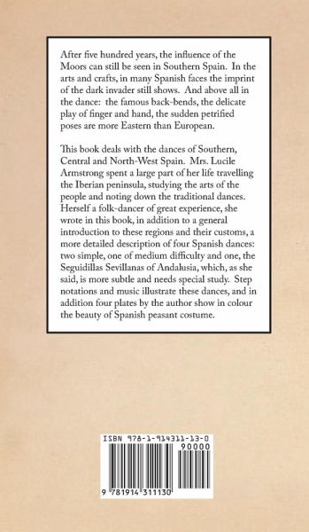 After five hundred years, the influence of the Moors can still be seen in Southern Spain. In the arts and crafts, in many Spanish faces the imprint of the dark invader still shows. And above all in the dance: the famous back-bends, the delicate play of finger and hand, the sudden petrified poses are more Eastern than European. This book deals with the dances of Southern, Central and North-West Spain. Mrs. Lucile Armstrong spent a large part of her life travelling the Iberian peninsula, studying the arts of the people and noting down the traditional dances. Herself a folk-dancer of great experience, she wrote in this book, in addition to a general introduction to these regions and their customs, a more detailed description of four Spanish dances: two simple, one of medium difficulty and one, the Seguidillas Sevillanas of Andalusia, which, as she said, is more subtle and needs special study. Step notations and music illustrate these dances, and in addition four plates by the author show in colour the beauty of Spanish peasant costume.