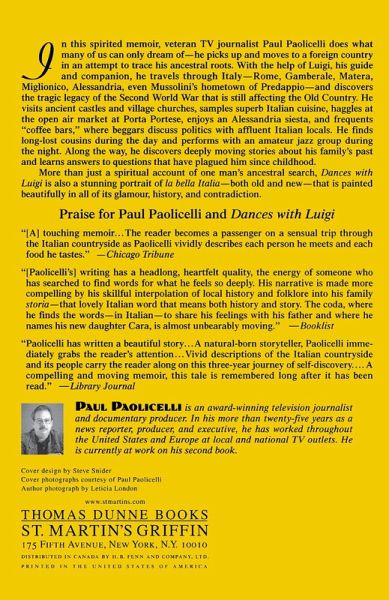 In this spirited memoir, veteran TV journalist Paul Paolicelli does what many of us can only dream of--he picks up and moves to a foreign country in an attempt to trace his ancestral roots. With the help of Luigi, his guide and companion, he travels through Italy--Rome, Gamberale, Matera, Miglionico, Alessandria, even Mussolini's hometown of Predappio--and discovers the tragic legacy of the Second World War that is still affecting the Old Country. He visits ancient castles and village churches, samples superb Italian cuisine, haggles at the open air market at Porta Portese, enjoys and Alessandria siesta, and frequents "coffee bars", where beggars discuss politics with affluent Italian locals. He finds lost-lost cousins during the day and performs with an amateur jazz group during the night. Along the way, he discovers deeply moving stories about his family's past and learns answers to question that have plagued him since childhood. More that just a spiritual account of one man's ancestral search, Dances With Luigi is also a stunning portrait of la bella Italia--both old and new--that is painted beautifully in all of its glamour, history, and contradiction.