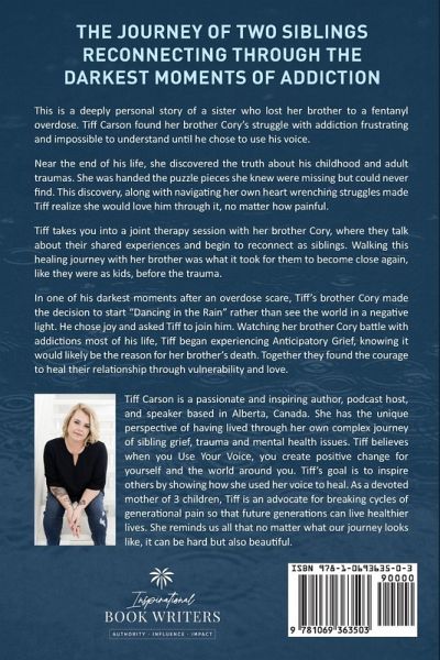 THE JOURNEY OF TWO SIBLINGS RECONNECTING THROUGH THE DARKEST MOMENTS OF ADDICTION This is a deeply personal story of a sister who lost her brother to a fentanyl overdose. Tiff Carson found her brother Cory's struggle with addiction frustrating and impossible to understand until he chose to use his voice. Near the end of his life, she discovered the truth about his childhood and adult traumas. She was handed the puzzle pieces she knew were missing but could never find. This discovery, along with navigating her own heart wrenching struggles made Tiff realize she would love him through it, no matter how painful. Tiff takes you into a joint therapy session with her brother Cory, where they talk about their shared experiences and begin to reconnect as siblings. Walking this healing journey with her brother was what it took for them to become close again, like they were as kids, before the trauma. In one of his darkest moments after an overdose scare, Tiff's brother Cory made the decision to start "Dancing in the Rain" rather than see the world in a negative light. He chose joy and asked Tiff to join him. Watching her brother Cory battle with addictions most of his life, Tiff began experiencing Anticipatory Grief, knowing it would likely be the reason for her brother's death. Together they found the courage to heal their relationship through vulnerability and love.