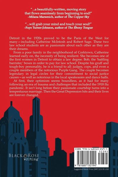 Detroit in the 1920s proved to be the Paris of the West for many-including Catherine McIntosh and Robert Sage. These two law school students are as passionate about each other as they are their dreams. From a poor family in the neighborhood of Corktown, Catherine learned early on, the necessity of being resilient. She becomes one of the first women in Detroit to obtain a law degree. Bob, the 'battling barrister,' boxes in order to pay for law school. Despite his gruff and tough-boy personality, he is a friend to all: judges, cops, and even a couple members of the notorious Purple Gang. The couple becomes legendary in legal circles for their commitment to social justice causes-as well as notorious in the local speakeasies and dance halls. At first, their optimism seems boundless, as it had for many following an era of trauma and challenges that included the 1918 flu pandemic. It isn't long before their passionate courtship turns into a tempestuous marriage. Then the Great Depression hits and their lives are forever changed.