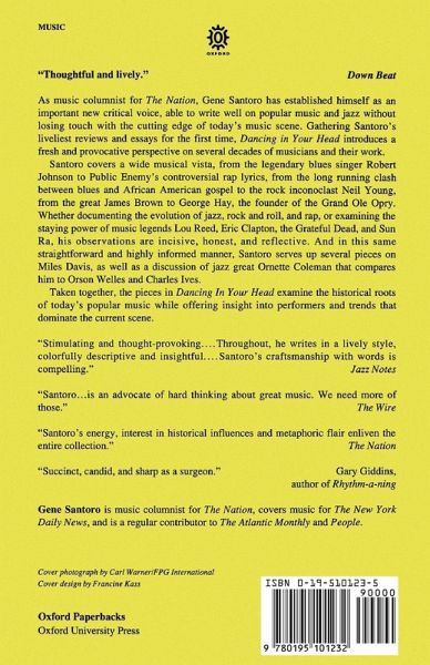 As music columnist for The Nation, Gene Santoro has established himself as an important new critical voice, able to write well on a broad spectrum of popular music and jazz, without losing touch with the cutting edge of today's music scene. Dancing in Your Head gathers Santoro's liveliest reviews and essays for the first time, introducing a fresh and provocative perspective on several decades of musicians and their work. From the legendary blues singer Robert Johnson to Miles Davis and James Brown, from the sounds of Neil Young and Lou Reed to Public Enemy's controversial rap lyrics, this books offers sharp and honest reflections on the evolution of jazz, rock and roll, and rap.