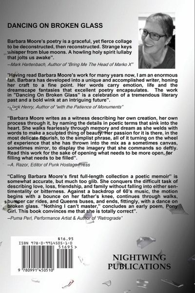 NightWing Publications Presents A powerful & touching collection of poetry chronicling the life stages of NY based writer Barbara H. Moore. "Barbara Moore writes as a witness describing her own creation, her own process through it, by naming the details in poetic terms that sink into the heart. She walks fearlessly through memory and dream as she welds with words to make a sculpted thing of beauty. Her passion for it is there, in the most delicate flourish to the simplest phrase, all of it turning on the wheel of experience that she has thrown into the mix as a sometimes canvas, sometimes mirror, to display the imagery that she commends so deftly. Read this work for the sake of opening what needs to be more open, for filling what needs to be filled". - A. Razor, Editor of Punk Hostage Press & Author of "Half-Century Status"