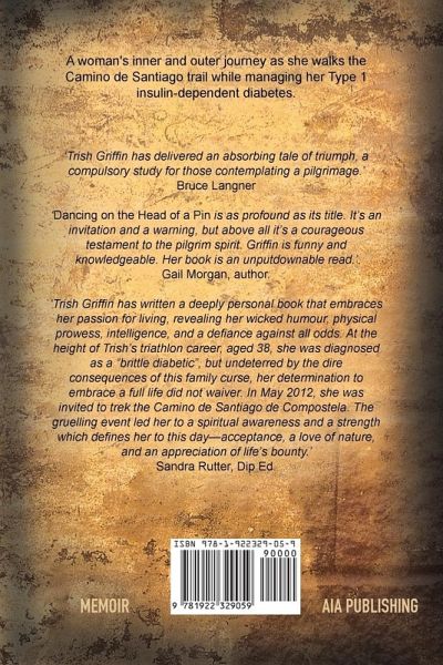 Dancing on the Head of a Pin: Reflections on the Camino chronicles Trish Griffin's inner and outer journey as she walks the Camino de Santiago trail while managing her Type 1 insulin-dependent diabetes. This is a deeply personal book that embraces the author's passion for living, revealing her wicked humour, physical prowess, intelligence, and a defiance against all odds. The paperback includes 71 colour photographs from the pilgrimage.