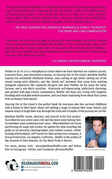 Hidden in all of us is a metaphorical closet where we have hoarded our darkest secrets, irrational fears, and unresolved traumas. In Dancing Out of the Closet, Matthew Shaffer exposes his outlandish childhood dramas, zany coming of age (while coming out of the closet) young adult debacles, and the "pinch me" moments that come from working alongside superstars like Leonardo DiCaprio and Amy Poehler on his quest for fame, fortune, and a size thirty waistline. Hilariously self-deprecating, addictively charming, and packed with pop culture commentary, Shaffer will have you crying with laughter, blushing with relatable embarrassment, and your heart exploding from shock that comes from an honest look inward. Dancing Out of the Closet is the perfect book for everyone who has survived childhood with a dream in their heart, those still seeking a stage to release their inner dancer, and anyone ready to laugh their way through the trials and triumphs of this journey we call life. Matthew Shaffer wrote, directed, and starred in his first production when he was seven years old and has been entertaining family members (and audiences) ever since. When Matthew isn't busy performing on stage and screen, he spends his time traveling the globe as an educator, choreographer, and content creator, collaborating with husband, Jeff Payton for their production company, A Group Production, Los Angeles, California. Shaffer is the author of the Amazon #1 New Release, So You Want To Be A Dancer.
