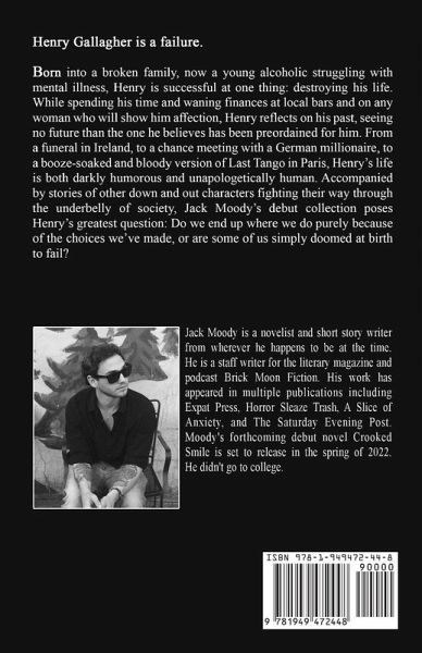 Henry Gallagher is a failure. Born into a broken family, now a young alcoholic struggling with mental illness, Henry is successful at one thing: destroying his life. While spending his time and waning finances at local bars and on any woman who will show him affection, Henry reflects on his past, seeing no future than the one he believes has been preordained for him. From a funeral in Ireland, to a chance meeting with a German millionaire, to a booze-soaked and bloody version of Last Tango in Paris, Henry's life is both darkly humorous and unapologetically human. Accompanied by stories of other down and out characters fighting their way through the underbelly of society, Jack Moody's debut collection poses Henry's greatest question: Do we end up where we do purely because of the choices we've made, or are some of us simply doomed at birth to fail?