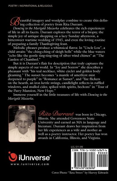 Beautiful imagery and wordplay combine to create this defining collection of poetry from Rita Durrant. Dancing to the Marigold Mazurka celebrates the rich experiences of life in all its facets. Durrant explores the terror of a biopsy, the simple joy of antique shopping on a lazy Sunday afternoon, a bittersweet wartime wedding of 1945, and even the loving routine of preparing a family Thanksgiving feast. Melodic phrases produce a whimsical flavor. In "Uncle Lou", a child awaits "the ching-ching of sleigh bells" while the blue waters "echo like the gentle ting-ting-ting of silver wind chimes" at "The Garden of Chambrel." But it is Durrant's flair for description that truly captures the simple aspects of our world. In "Joy and Sorrow" she describes a pheasant with "his teal necklace, white circlet and golden body gleaming." The sunset becomes "a mantle of amethyst mist deepened to purple" in "Romance at Sunset", and "fire flickers on the hearth, an iron kettle swings, candlelight reflects in ruffled windows, and mulled cider, spiked with spirits, beckons" in "Tour of the Parry Mansion, New Hope." Immerse yourself in the little treasures of life with Dancing to the Marigold Mazurka.