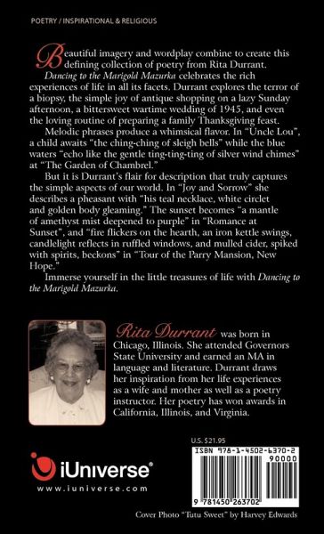 Beautiful imagery and wordplay combine to create this defining collection of poetry from Rita Durrant. Dancing to the Marigold Mazurka celebrates the rich experiences of life in all its facets. Durrant explores the terror of a biopsy, the simple joy of antique shopping on a lazy Sunday afternoon, a bittersweet wartime wedding of 1945, and even the loving routine of preparing a family Thanksgiving feast. Melodic phrases produce a whimsical flavor. In "Uncle Lou", a child awaits "the ching-ching of sleigh bells" while the blue waters "echo like the gentle ting-ting-ting of silver wind chimes" at "The Garden of Chambrel." But it is Durrant's flair for description that truly captures the simple aspects of our world. In "Joy and Sorrow" she describes a pheasant with "his teal necklace, white circlet and golden body gleaming." The sunset becomes "a mantle of amethyst mist deepened to purple" in "Romance at Sunset", and "fire flickers on the hearth, an iron kettle swings, candlelight reflects in ruffled windows, and mulled cider, spiked with spirits, beckons" in "Tour of the Parry Mansion, New Hope." Immerse yourself in the little treasures of life with Dancing to the Marigold Mazurka.