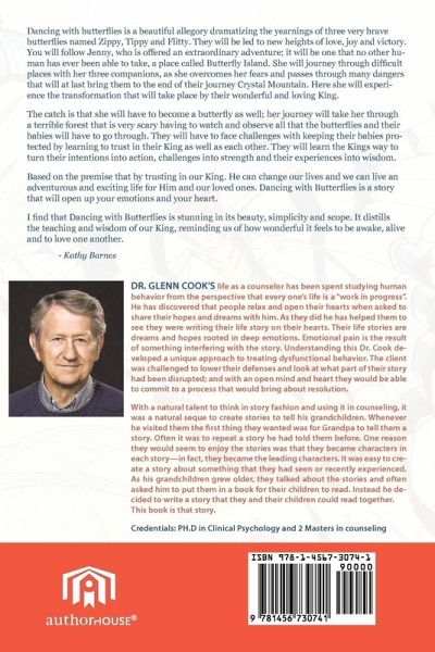 Dancing with butterflies is a beautiful allegory dramatizing the yearnings of three very brave butterflies named Zippy, Tippy and Flitty. They will be led to new heights of love, joy and victory. You will follow Jenny, who is offered an extraordinary adventure; it will be one that no other human has ever been able to take, a place called Butterfly Island. She will journey through difficult places with her three companions, as she overcomes her fears and passes through many dangers that will at last bring them to the end of their journey Crystal Mountain. Here she will experience the transformation that will take place by their wonderful and loving King. The catch is that she will have to become a butterfly as well; her journey will take her through a terrible forest that is very scary having to watch and observe all that the butterflies and their babies will have to go through. They will have to face challenges with keeping their babies protected by learning to trust in their King as well as each other. They will learn the Kings way to turn their intentions into action, challenges into strength and their experiences into wisdom. Based on the premise that by trusting in our King. He can change our lives and we can live an adventurous and exciting life for Him and our loved ones. Dancing with Butterflies is a story that will open up your emotions and your heart. I find that Dancing with Butterflies is stunning in its beauty, simplicity and scope. It distills the teaching and wisdom of our King, reminding us of how wonderful it feels to be awake, alive and to love one another. Kathy Barnes