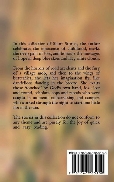 In this collection of Short Stories, the author celebrates the innocence of childhood, marks the deep pain of loss, and honours the messages of hope in deep blue skies and lacy white clouds. From the horrors of a road accident and the fury of a village mob, to near death experiences and then to the wings of butterflies, she lets her imagination fly, like dandelions dancing in the breeze. She celebrates children who found perfection in the imperfect, aunts and uncles who learnt lessons the hard and hilarious way, love lost and found, leaders, scholars, cops and rascals who were caught in moments embarrassing and campers who worked through the night to start one little fire in the rain. The stories in this collection do not conform to any theme and are purely for the joy of quick and easy reading.