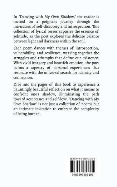 In "Dancing with My Own Shadow," the reader is invited on a poignant journey through the intricacies of self-discovery and introspection. This collection of lyrical verses captures the essence of solitude, as the poet explores the delicate balance between light and darkness within the soul. Each poem dances with themes of introspection, vulnerability, and resilience, weaving together the struggles and triumphs that define our existence. With vivid imagery and heartfelt emotion, the poet paints a tapestry of personal experiences that resonate with the universal search for identity and connection. Dive into the pages of this book to experience a hauntingly beautiful reflection on what it means to confront one's shadow, illuminating the path toward acceptance and self-love. "Dancing with My Own Shadow" is not just a collection of poems but an intimate invitation to embrace the complexity of being human.
