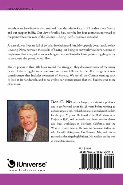 Somehow we have become disconnected from the infinite Ocean of Life that is our Source and our support in life. Our view of reality has, over the last four centuries, narrowed to the point where the core of the Cosmos-Being Itself-has been excluded. As a result, our lives are full of despair, desolation and fear. Most people do not realize what is wrong. Now, however, the results of having lost Being in our worldview have become so unpleasant that many of us are reaching out toward Invisible Livingness, struggling to try to recapture the ground of our lives. The 77 poems in this little book record this struggle. They document some of the many facets of the struggle, some successes and some failures, in the effort to grow a new consciousness that includes awareness of Majesty. We are all the Cosmos turning back to look at its handiwork, and as we evolve our consciousness that will become ever more clear to us.