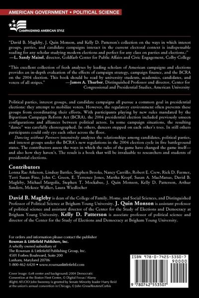 Political parties, interest groups, and candidate campaigns all pursue similar goals in presidential elections: each entity attempts to mobilize voters. However, the regulatory environment often prevents these groups from coordinating their efforts. With participants playing by new rules mandated by the Bipartisan Campaign Reform Act, the 2004 presidential election included previously unseen configurations and alliances between political actors. In some campaign situations, the resulting 'dance' was carefully choreographed. In others, dancers stepped on each other's toes. In still others, participants could only eye each other across the floor. Dancing without Partners intensively analyzes the relationships among candidates, political parties, and interest groups under the BCRA's new regulations in the 2004 election cycle in five battleground states. The chapters assess the ways in which the rules of the game have changed the game itself_and also how they haven't. The result is a book that will be invaluable to researchers and students of presidential elections.