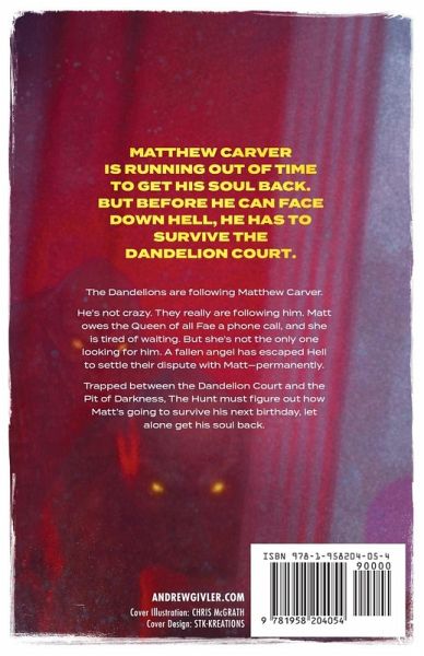 The Dandelions are following Matthew Carver. He's not crazy. They really are following him. Matt owes the Queen of all Fae a phone call, and she is tired of waiting. But she's not the only one looking for him. A fallen angel has escaped Hell to settled their dispute with Matt-permanently. Trapped between the Dandelion Court and the Pit of Darkness, The Hunt must figure out how Matt's going to survive his next birthday, let alone get his soul back.