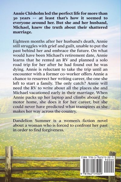 Annie Chisholm led the perfect life for more than 30 years -- at least that's how it seemed to everyone around her. But she and her husband, Michael, knew the truth about their shattered marriage. Eighteen months after her husband's death, Annie still struggles with grief and guilt, unable to put the past behind her and embrace the future. On what would have been Michael's retirement date, Annie learns that he rented an RV and planned a solo road trip for her after he had found out he was dying. Annie is reluctant to take the trip until an encounter with a former co-worker offers Annie a chance to resurrect her writing career, the one she left to start a family. The only catch? Annie will need the RV to write about all the places she and Michael vacationed early in their marriage. When Annie packs up her laptop and climbs aboard the motor home, she does it for her career, but she could never have predicted what transpires as she makes her way across the country. Dandelion Summer is a women's fiction novel about a woman who is forced to confront her past in order to find forgiveness. This title is the large print version created specially for low-vision readers.