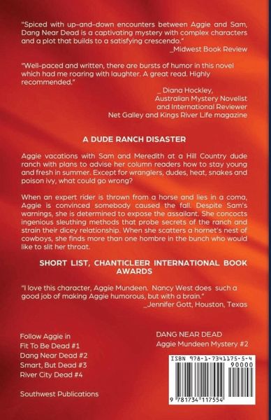 DANG NEAR DEAD, Aggie Mundeen Mystery #2 IN THIS AWARD-WINNING SERIES: HOME ON THE RANGE CAN BE MURDER Aggie Mundeen, friend Meredith, and Detective Sam (incognito) vacation at a Texas dude ranch where Aggie will research how to stay young and fresh in summer for her column readers. What could go wrong? Cowhands hide secrets, the ranch manager envies her assistant, and former ranch owners died suspiciously. When an expert rider is thrown from a horse and lies hospitalized in a coma, Aggie is convinced somebody caused the fall. Despite Sam's warnings, she concocts ingenious methods to expose…mehr
