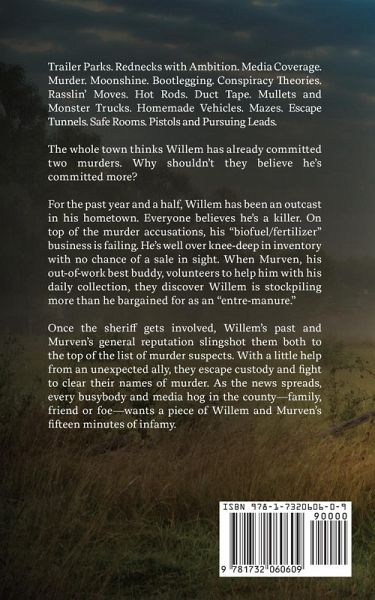 Trailer parks. Rednecks with ambition. Media coverage. Murder. Moonshine. Bootlegging. Conspiracy theories. Rasslin' moves. Hot rods. Duct tape. Mullets and monster trucks. Homemade vehicles. Mazes. Escape tunnels. Safe rooms. Pistols and pursuing leads. The whole town thinks Willem has already committed two murders. Why shouldn't they believe he's committed more? For the past year and a half, Willem has been an outcast in his hometown. Everyone believes he's a killer. On top of the murder accusations, his "biofuel/fertilizer" business is failing. He's well over knee-deep in inventory with no chance of a sale in sight. When Murven, his out-of-work best buddy, volunteers to help him with his daily collection, they discover Willem is stockpiling more than he bargained for as an "entre-manure." Once the sheriff gets involved, Willem's past and Murven's general reputation slingshot them both to the top of the list of murder suspects. With a little help from an unexpected ally, they escape custody and fight to clear their names of murder. As the news spreads, every busybody and media hog in the county-family, friend or foe-wants a piece of Willem and Murven's fifteen minutes of infamy. A not-so-cozy Southern mystery for action & adventure and cozy mystery lovers!
