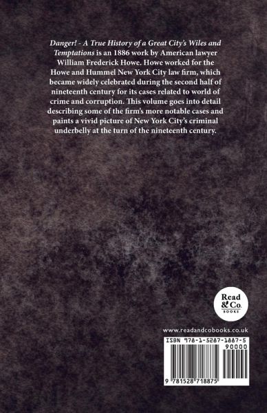 "Danger! - A True History of a Great City's Wiles and Temptations" is an 1886 work by American lawyer William Frederick Howe. Howe worked for the Howe and Hummel New York City law firm, which became widely celebrated during the second half of nineteenth century for its cases related to world of crime and corruption. This volume goes into detail describing some of the firm's more notable cases and paints a vivid picture of New York City's criminal underbelly at the turn of the nineteenth century. Contents include: "Ancient and Modern Prisons", "Criminals and their Haunts", "Street Arabs of Both Sexes", "Store Girls", "The Pretty Waiter Girl", "Shop-Lifters", "Kleptomania", "Panel Houses and Panel Thieves", "A Theatrical Romance", "A Mariner's Wooing", "The Baron and 'Baroness'", "The Demi-Monde", "Passion's Slaves and Victims", etc. Read & Co. History is proudly republishing this classic work now in a brand new edition complete with the introductory chapter 'The Pleasant Fiction of the Presumption of Innocence' by Arthur Train.