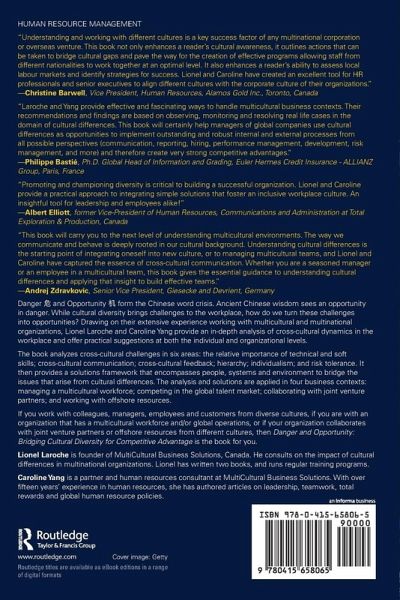 The Chinese characters for "danger" and "opportunity" form the word "crisis". Ancient Chinese wisdom sees an opportunity in danger. While cultural diversity brings challenges to the workplace, how do we turn these challenges into opportunities? Drawing on their extensive experience working with multicultural and multinational organizations, Lionel Laroche and Caroline Yang provide an in-depth analysis of cross-cultural dynamics in the workplace and offer practical suggestions at both the individual and organizational levels. The book analyzes cross-cultural challenges in six areas: the relative importance of technical and soft skills; cross-cultural communication; cross-cultural feedback; hierarchy; individualism; and risk tolerance. It then provides a solutions framework that encompasses people, systems and environment to bridge the issues that arise from cultural differences. The analysis and solutions are applied in four business contexts: managing a multicultural workforce; competing in the global talent market; collaborating with joint venture partners; and working with offshore resources. If you work with colleagues, managers, employees and customers from diverse cultures, if you are with an organization that has a multicultural workforce and/or global operations, or if your organization collaborates with joint venture partners or offshore resources from different cultures, then Danger and Opportunity: Bridging Cultural Diversity for Competitive Advantage is the book for you.