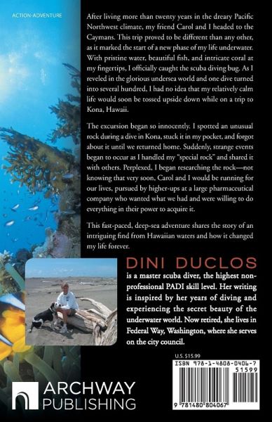 After living more than twenty years in the dreary Pacific Northwest climate, my friend Carol and I headed to the Caymans. This trip proved to be different than any other, as it marked the start of a new phase of my life underwater. With pristine water, beautiful fish, and intricate coral at my fingertips, I officially caught the scuba diving bug. As I reveled in the glorious undersea world and one dive turned into several hundred, I had no idea that my relatively calm life would soon be tossed upside down while on a trip to Kona, Hawaii. The excursion began so innocently. I spotted an unusual rock during a dive in Kona, stuck it in my pocket, and forgot about it until we returned home. Suddenly, strange events began to occur as I handled my "special rock" and shared it with others. Perplexed, I began researching the rock-not knowing that very soon, Carol and I would be running for our lives, pursued by higher-ups at a large pharmaceutical company who wanted what we had and were willing to do everything in their power to acquire it. This fast-paced, deep-sea adventure shares the story of an intriguing find from Hawaiian waters and how it changed my life forever.