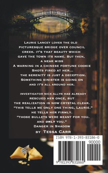 Laurie Lancey has always loved the old picturesque bridge over Council Creek; it's that beauty which gave the town its name. But then... A near miss... A chinese fortune cookie with a deadly warning A murdered co-worker She knows now the serenity is just a deception. Something sinister is going on here, And it's all around her. Investigator Nick Allyn barely manages to save her when the shots are fired. "This tells me only one thing, young lady," he tells her firmly. "Those bullets were meant for you. And only you." Danger in Shadow... The Shadows of Council Creek (Book Two) by Tessa Carr