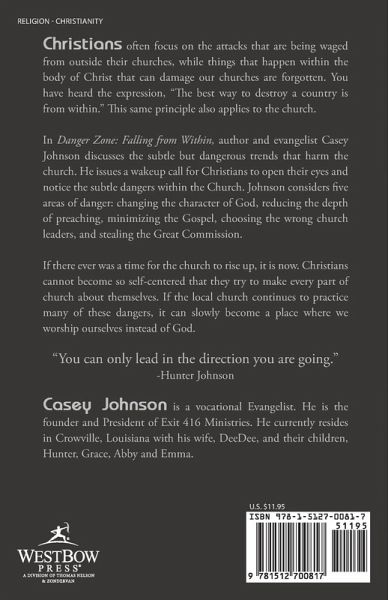 Christians often focus on the attacks that are being waged from outside their churches, while things that happen within the body of Christ that can damage our churches are forgotten. You have heard the expression, "The best way to destroy a country is from within." This same principle also applies to the church. In Danger Zone: Falling from Within, author and evangelist Casey Johnson discusses the subtle but dangerous trends that harm the church. He issues a wakeup call for Christians to open their eyes and notice the subtle dangers within the Church. Johnson considers five areas of danger: changing the character of God, reducing the depth of preaching, minimizing the Gospel, choosing the wrong church leaders, and stealing the Great Commission. If there ever was a time for the church to rise up, it is now. Christians cannot become so self-centered that they try to make every part of church about themselves. If the local church continues to practice many of these dangers, it can slowly become a place where we worship ourselves instead of God. "You can only lead in the direction you are going." -Hunter Johnson