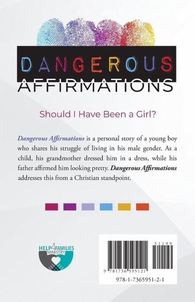 Should I have been a girl? Dangerous Affirmations is a personal story of a young boy who shares his struggle of living in his male gender. As a child, his grandmother dressed him in a dress, while his father affirmed him looking pretty. Dangerous Affirmations addresses this from a Christian standpoint.