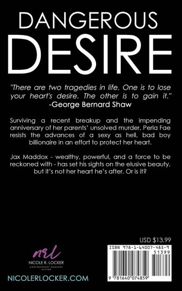 "There are two tragedies in life. One is to lose your heart's desire. The other is to gain it." -George Bernard Shaw Surviving a recent breakup and the impending anniversary of her parents’ unsolved murder, Perla Fae resists the advances of a sexy as hell, bad boy billionaire in an effort to protect her heart. Jax Maddox - wealthy, powerful, and a force to be reckoned with - has set his sights on the elusive beauty, but it’s not her heart he’s after. Or is it? Dangerous Desire is a Contemporary, Adult/New-Adult Romance Novel recommended for ages 18+. If you love contemporary romance books with themes of mystery, suspense, and unexpected plot twists, then Dangerous Desire is waiting for you!