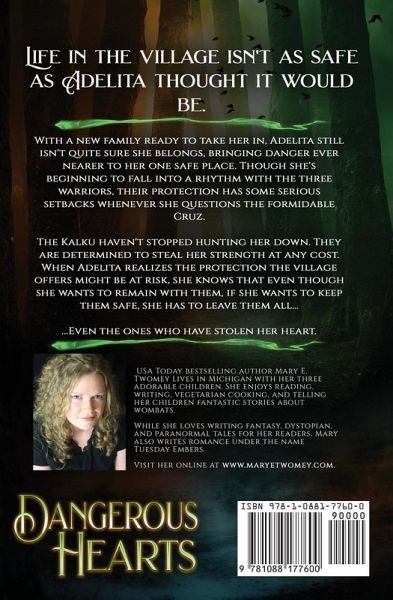 Life in the village isn't as safe as Adelita thought it would be. With a new family ready to take her in, Adelita still isn't quite sure she belongs, bringing danger ever nearer to her one safe place. Though she's beginning to fall into a rhythm with the three warriors, their protection has some serious setbacks whenever she questions the formidable Cruz. The Kalku haven't stopped hunting her down. They are determined to steal her strength at any cost. When Adelita realizes the protection the village offers might be at risk, she knows that even though she wants to remain with them, if she wants to keep them safe, she has to leave them all... ...Even the ones who have stolen her heart. If you like first kisses with a bit of sweetness and scandal, you'll love this urban fantasy romance series with a dystopian edge. The series is based in Hispanic folklore, with an entirely Hispanic cast of characters, written by USA Today bestselling author Mary E. Twomey.