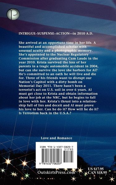 INTRIGUE - SUSPENSE - LOVE -in 2010 A.D. She arrived at an opportune time in her life. A beautiful and accomplished scholar with unusual acuity and a photographic memory. She's appointed to the NRC after graduating Cum Laude in the year 2010. Krista survived the loss of her parents in a tragic automobile accident in 2004, but can she survive the love she harbors for Al? He's committed to an oath he will live and die for. Three of his friends want to disrupt our Nation's Capital with a dirty bomb on Memorial Day, 2011.There hasn't been a terrorist's act on U.S. soil in over 6 years. Al must get close to Krista and obtain information about her job at the NRC, but he begins to fall in love with her. Krista's thrust into a relationship full of lies and deceit and Al must prove his love to her. Can he do it? How will he do it? Is Terrorism back in the U.S. A.?