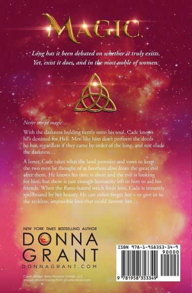 Never tempt magic... With the darkness holding firmly onto his soul, Cade knows he's destined for Hell. Men like him don't perform the deeds he has, regardless if they came by order of the king, and not elude the darkness... A loner, Cade takes what the land provides and vows to keep the two men he thought of as brothers alive from the great evil after them. He knows his time is short and the evil is looking for him, but there is just enough humanity left in him to aid his friends. When the flame-haired witch finds him, Cade is instantly spellbound by her beauty. He can either forget her - or give in to the reckless, impossible love that could destroy her...