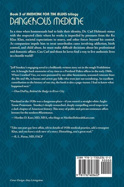 Dangerous Medicine, Book 3 of the trilogy Medicine for the Blues In a time when homosexuals had to hide their identity, Dr. Carl Holman's standing with the prestigious clinic where he works is strained to the breaking point by pressures from the Ku Klux Klan, societal expectations to marry and have children, and other forces beyond his control. As his compassion compels him to treat unorthodox cases, involving addiction, birth control, and child abuse, he is pushed to make increasingly difficult decisions about his professional and domestic affairs. Can Carl and those he loves find a way to live authentic lives in this hostile world? This is Book 3 of Medicine for the Blues, an LGBT historical novel trilogy. Based on extensive period research, Dangerous Medicine continues the exploration of the gay world of 1920s in Portland, Oregon. Set against the dramatic backdrop of this influential era, this final volume brings to a close the touching gay love story that began in Book 1 Acquaintance.