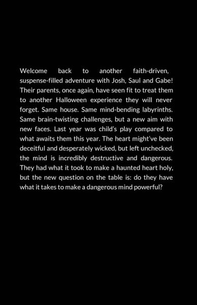 Welcome back to another faith-driven, suspense-filled adventure with Josh, Saul and Gabe! Their parents, once again, have seen fit to treat them to another Halloween experience they will never forget. Same house. Same mind-bending labyrinths. Same brain-twisting challenges, but a new aim with new faces. Last year was child's play compared to what awaits them this year. The heart might've been deceitful and desperately wicked, but left unchecked, the mind is incredibly destructive and dangerous. They had what it took to make a haunted heart holy, but the new question on the table is: do they have what it takes to make a dangerous mind powerful?
