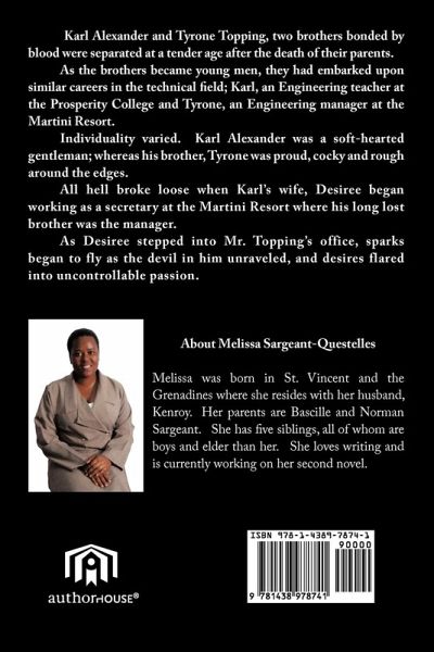 Karl Alexander and Tyrone Topping, two brothers bonded by blood were separated at a tender age after the death of their parents. As the brothers became young men they had embarked upon similar career, landing them in the technical field --- Karl an Engineering teacher at the Prosperity College and Tyrone an Engineering manager at the Martini Resort. Individuality varied. Karl was a soft-hearted gentleman, whereas, his brother Tyrone was proud, cocky and rough around the edges. All hell broke loose when Karl's wife, Desiree began working as a secretary at the Martini Resort. As she stepped foot into Mr. Topping's office, sparks began flying as the devil in him began to unravel and conquer dangerous territories.