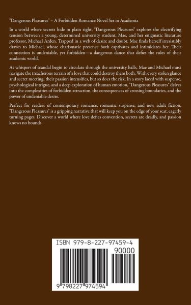 "Dangerous Pleasures" - A Forbidden Romance Novel Set in Academia In a world where secrets hide in plain sight, "Dangerous Pleasures" explores the electrifying tension between a young, determined university student, Mae, and her enigmatic literature professor, Michael Arden. Trapped in a web of desire and doubt, Mae finds herself irresistibly drawn to Michael, whose charismatic presence both captivates and intimidates her. Their connection is undeniable, yet forbidden-a dangerous dance that defies the rules of their academic world. As whispers of scandal begin to circulate through the university halls, Mae and Michael must navigate the treacherous terrain of a love that could destroy them both. With every stolen glance and secret meeting, their passion intensifies, but so does the risk. In a story laced with suspense, psychological intrigue, and a deep exploration of human emotion, "Dangerous Pleasures" delves into the complexities of forbidden attraction, the consequences of crossing boundaries, and the power of undeniable desire. Perfect for readers of contemporary romance, romantic suspense, and new adult fiction, "Dangerous Pleasures" is a gripping narrative that will keep you on the edge of your seat, eagerly turning pages. Discover a world where love defies convention, secrets are deadly, and passion knows no bounds.